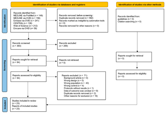 The PRISMA flowchart is shown in Figure 1. A total of 391 records were searched on 16 October 2023. After screening, 23 studies (2249 patients) were included in the qualitative synthesis [11,12,13,14,15,16,17,18,19,20,21,22,23,24,25,26,27,28,29,30,31,32,33] and in the quantitative synthesis [11,12,13,14,15,16,17,18,19,20,21,22,23,24,25,26,27,28,29,30,31,32,33]. No unpublished data or ongoing studies were identified. The reasons for exclusion were incorrect population (n = 40), incorrect control (n = 4), protocol without results (n = 1), insufficient outcome data (n = 9), duplicate records (n = 2), and other reasons (n = 16).
