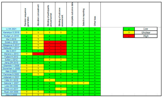 Figure 2 summarizes the ROB in the included studies. Regarding postoperative complications, there was a low ROB for incomplete outcome data and selective reporting and a low ROB or “some concerns” for random sequence generation and allocation concealment. The ROB for the participant and personnel blinding and outcome assessment were low”, some concerns” or high.