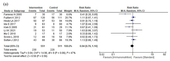 Nine studies reported total postoperative complications. Immunonutrition does not reduce total postoperative complications compared to standard nutritional therapy (RR: 0.94, 95% CI: 0.76–1.16, I2 = 47%, n = 9, COE: moderate; Figure 3a).