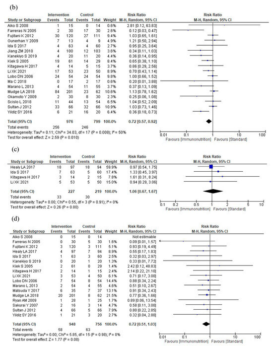 Seventeen studies reported anastomotic leakage. Immunonutrition probably reduces anastomotic leakage compared to standard nutritional therapy (RR: 0.72, 95% CI: 0.51–1.03, I2 = 0%, n = 17, COE: moderate, Figure 3d).