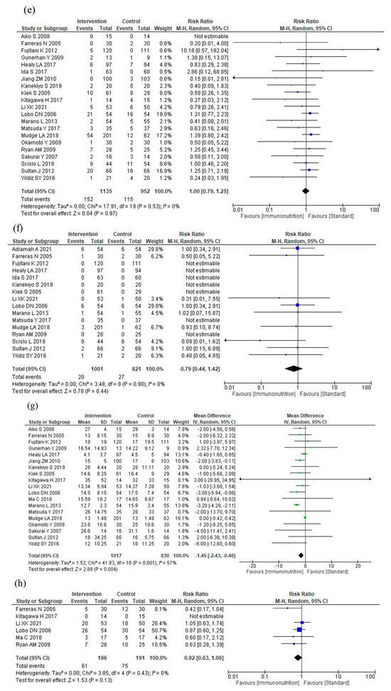 Results of meta-analysis: (a) total postoperative complications, (b) infectious complications, (c) severe complications, (d) anastomotic leakage, (e) postoperative pneumonia, (f) mortality, (g) postoperative hospital stay, and (h) nutritional intervention adverse events.