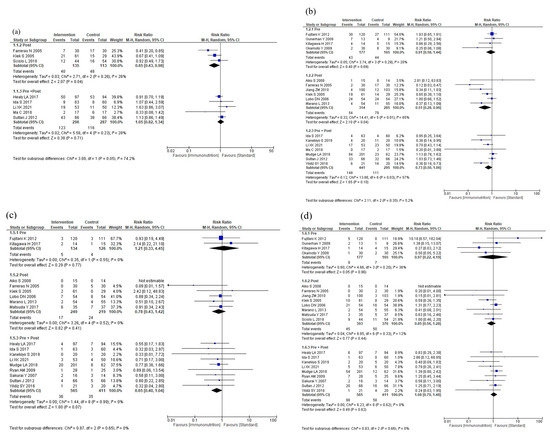 Four studies reported severe complications. Immunonutrition is unlikely to reduce severe complications compared to standard nutritional therapy (RR: 1.06, 95% CI: 0.67–1.67, I2 = 0%, n = 4; COE: moderate; Figure 3c).