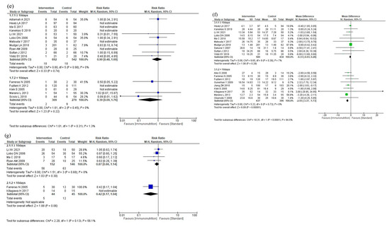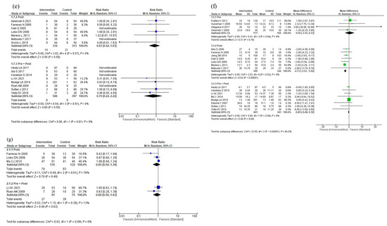 Results of subgroup analyses for ingredient difference: (a) total postoperative complications, (b) infectious complications, (c) severe complications, (d) anastomotic leakage, (e) postoperative pneumonia, (f) mortality, and (g) postoperative hospital stay.