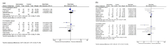 The results of the subgroup analyses according to cancer site are shown in Figure 5. The subgroup analyses showed no efficacy differences between the groups according to the cancer site for total postoperative complications (p = 0.33, Figure 5a), infectious complications (p = 0.17, Figure 5b), anastomotic leakage (p = 0.39, Figure 5c), postoperative pneumonia (p = 0.68, Figure 5d), and mortality (p = 0.48, Figure 5e). Postoperative hospital stay was shorter in the gastric cancer group than in the esophageal cancer group (p < 0.001, Figure 5f). The subgroup analysis for adverse events showed no efficacy difference between the groups (p = 0.16, Figure 5g). The subgroup analysis for severe complications was not performed due to the small number of studies.