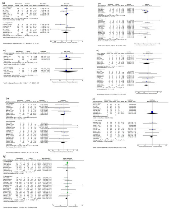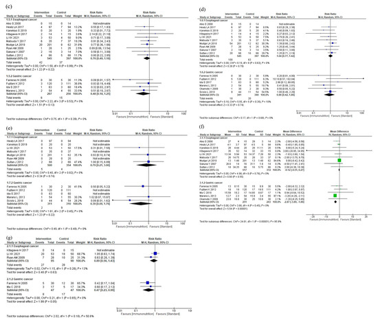 Results of subgroup analyses according to cancer site: (a) total postoperative complications, (b) infectious complications, (c) anastomotic leakage, (d) postoperative pneumonia, (e) mortality, (f) postoperative hospital stay, and (g) nutritional intervention adverse event.