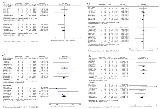 We performed subgroup analysis with a cutoff value of >50% malnutrition, but there was no difference in postoperative complications between patients with and without malnutrition, and only postoperative hospital stay was significantly different. There were no RCTs in which all patients were malnourished. Riso et al. [43] compared postoperative outcomes in patients with malnutrition in head and neck cancer and reported no severe complications in the immunonutrition group. In this subgroup analysis, the reason for the absence of significant differences in postoperative complications was due to the small number of RCTs that included malnutrition. Immunomodulation by administration of immunonutrition may be necessary in patients with malnutrition because of the possibility of immune impairment, but this was not evident in this study. Further studies on patients with malnutrition are required.