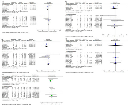 The results of the subgroup analyses according to malnutrition are shown in Figure 8. The subgroup analyses showed no efficacy differences between the groups according to the malnutrition for infectious complications (p = 0.51, Figure 8a), anastomotic leakage (p = 0.94, Figure 8b), postoperative pneumonia (p = 0.09, Figure 8c), and mortality (p = 0.94, Figure 8d). Postoperative hospital stay was shorter in the malnutrition group than in the no-malnutrition group (p < 0.001, Figure 8e). The subgroup analyses for total complications, severe complications, and adverse events were not performed due to the small number of studies.