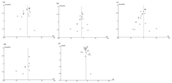 The funnel plots are shown in Figure 9. Funnel plots were visualized as symmetrical, indicating minimal publication bias in the reporting of infectious complications (Figure 9a), anastomotic leakage (Figure 9b), postoperative pneumonia (Figure 9c), mortality (Figure 9d), and postoperative hospital stay (Figure 9e). For total postoperative complications, severe complications, and adverse events, funnel plots were not prepared because there were fewer than 10 references, as per the Cochrane Handbook [7].