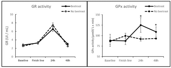 Figure 1. Effect of beetroot supplementation on GR and GPx activity. * p < 0.05 vs. no beetroot supplementation group.
