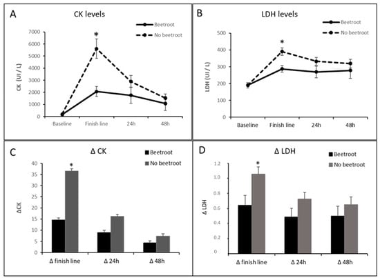 When the effect of beetroot intake on muscle damage was studied, it was observed that both the CK and LDH levels were significantly higher at the finish line in the runners who did not consume beetroot compared to those who did (Figure 2A,B). Similar results were obtained with respect to the CK and LDH delta values (Figure 2C,D).