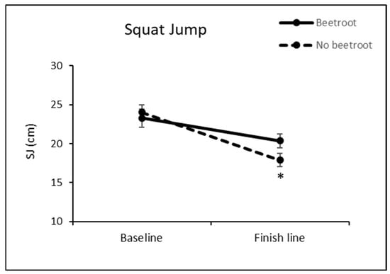 Figure 3. Effect of beetroot supplementation on SJ performance. * p < 0.05 vs. baseline value.