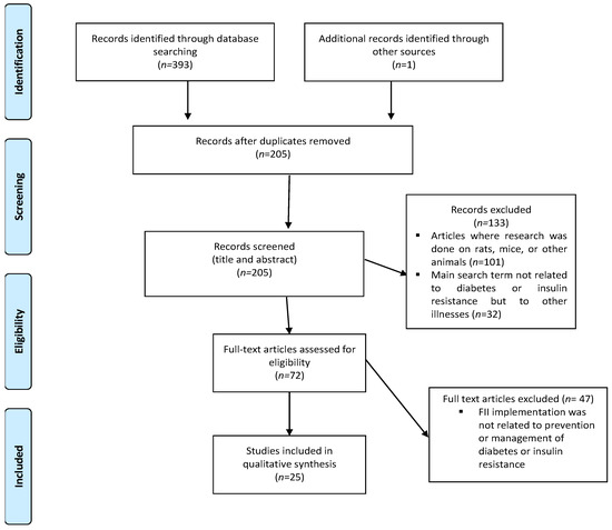 Our search returned a total of 394 results, which consisted of 393 articles listed on electronic databases and 1 article from grey literature (Figure 1). After duplicates were removed, 205 articles remained, of which 134 articles were excluded because studies were not performed on humans (n = 101), and because FII was linked to other illnesses (not diabetes or insulin resistance) (n = 32). Full-text screening was performed on 72 articles of which 47 were excluded. Data extraction was performed on the remaining 25 articles [27,29,30,36,37,38,39,40,41,42,43,44,45,46,47,48,49,50,51,52,53,54,55,56,57].