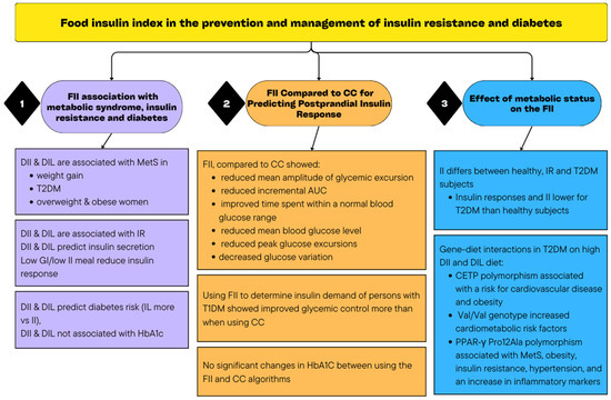 All the articles that were included examined the effect of incorporating the FII to predict insulin response or how it is linked to diabetes or insulin resistance development or management. The findings are reported according to the identified main themes (Table 1). Figure 2 includes a visual summary of the findings of the scoping review.