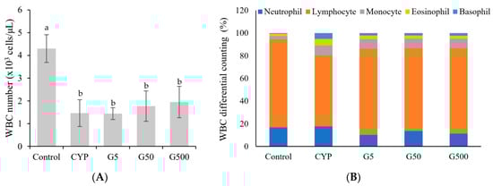 Effect of Galium aparine extracts on white blood cell differential count and composition (%) in cyclophosphamide-treated mice. Control group (saline), CYP: cyclophosphamide injection; G5 group: 5 mg/head GAE injection; G50 group: 50 mg/head GAE injection; G500 group: 500 mg/head GAE injection. (A) WBC number. (B) WBC differential counting. The data are expressed as the mean ± SD, showing significant differences (p < 0.05) with different letters among the 5 groups.