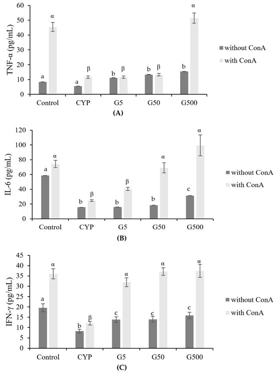 Effects of Galium aparine extracts on TNF-α, IL-6, and IFN-γ production from ConA-stimulated primary splenocytes prepared from cyclophosphamide-treated mice. (A) TNF-α. (B) IL-6. (C) IFN-γ. The data are expressed as the mean ± SD, showing significant differences (p < 0.05) with different letters among the 5 groups for each ConA treatment condition.