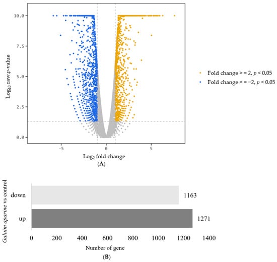 Changes in mRNA expression. (A) Volcano plot (B) The number of up-regulated and down-regulated genes. |Fold change| ≥ 2, p < 0.05.