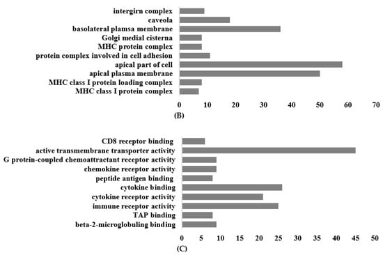 The most significantly enriched Gene Ontology (GO) annotations in the classification of biological processes, cellular components, and molecular function among the differentially expressed mRNAs are shown in Figure 6. For the biological process, the primary enriched GO terms included positive regulation of cytokine production, positive regulation of response to external stimulus, response to molecules of bacterial origin, regulation of cell–cell adhesion, positive regulation of defense response, and regulation of adaptive immune response. In terms of molecular function, the genes exhibited activities related to active transmembrane transporter activity, cytokine binding, cytokine receptor activity, and immune receptor activity (Figure 6A).