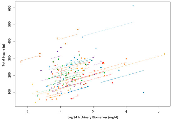 The within-subject repeated measures correlations between the biomarker and total sugars intake, seen in Figure 2, were stronger (rrm = 0.44, p < 0.0001, 95% CI = 0.27–0.59) than the between-subject Pearson correlation coefficients shown, in Figure 1. The ICC (95% CI) for the biomarker was 0.60 (0.50–0.76) and 0.73 (0.63–0.82) for the total sugars intake.