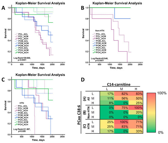 As both C14-carnitine and PCaa C38:6 are important predictors for mortality in sarcopenic patients, we examined the possibility that a combination of these two metabolites can be a more adequate biomarker. The study populations were categorized into nine groups according to tertile C14-carnitine and PCaa C38:6 (Table S3). The Kaplan–Meier plots presented all sarcopenia patients (Figure 2A) and the non-HTN (Figure 2B) and HTN (Figure 2C) patients within this cohort. The mortalities of various cohorts were tabulated in the heatmap of mortality (Figure 2D). For the non-HTN sarcopenia patients, death occurred only in the low PCaa C38:6, mid C14-carnitine (PCL_ACM) cohort, the low PCaa C38:6, high C14-carnitine (PCL_ACH) cohort, and the mid PCaa C38:6, high C14-carnitine (PCM_ACH) cohort (Figure 2B,D). For the HTN sarcopenia patients, the mortalities increased significantly in the low PCaa C38:6, mid C14-carnitine (PCL_ACM) cohort, the mid PCaa C38:6, mid C14-carnitine (PCM_ACM) cohort, the low PCaa C38:6, high C14-carnitine (PCL_ACH) cohort, and the mid PCaa C38:6 and high C14-carnitine (PCM_ACH) cohort (Figure 2C,D). A high plasma PCaa C38:6 level is indicative of the better survival of sarcopenia patients. Even so, the mortality of the HTN patients with high plasma PCaa C38:6 levels increased moderately when they had high C14-carnitine levels (i.e., high PCaa C38:6, high C14-carnitine (PCH_ACH) HTN cohort). These findings suggest that the low plasma PCaa 38:6 and high plasma C14-carnitine are associated with the mortality of sarcopenic patients. There appears to be an interaction between these factors in determining the mortality outcome.