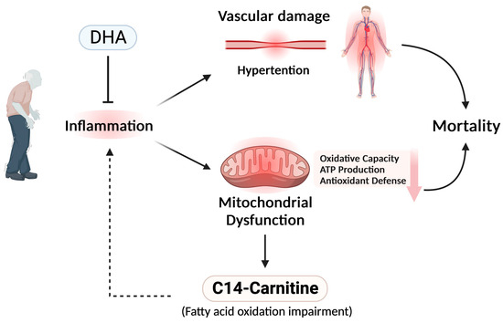 The combined metabolomic and epidemiological approach taken by our study has an implication about the pathogenic processes leading to the demise of sarcopenic patients. It is hypothesized that mitochondrial dysfunction occurs during aging. The release of C14-carnitine into the bloodstream may promote chronic systemic low-grade inflammation (inflammaging) [75] and aggravate the vascular inflammation and dysfunction associated with hypertension [76]. Mitochondrial dysfunction is accompanied by a reduction in oxidative phosphorylation capacity, ATP production, and antioxidant defense. These biochemical events exacerbate the pathophysiological condition. DHA released from PCaa exerts anti-inflammatory and antioxidative effects to contain the inflammation-induced damages. Moreover, DHA has other health-promoting functions (e.g., cardioprotective, antiarrhythmic, and antithrombotic activities, and a tissue repair-promoting effect). The reduction in DHA-containing phospholipids and the increase in C14-carnitine contribute to systemic inflammation, and predispose the individuals to serious health deterioration and even death. The model is illustrated in Figure 3.