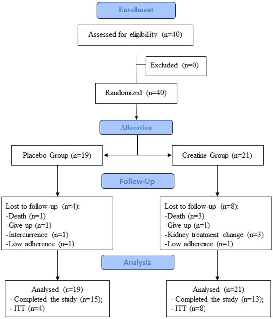 The study was performed with 40 patients divided into two groups balanced by gender and age (Table 1): (1) Placebo Group (PG) composed of 19 patients who received maltodextrin, and (2) Creatine Group (CG) composed of 21 patients who received creatine (Figure 1).