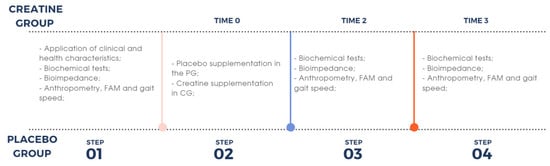 The intervention was separated into four steps after the balancing and division of the groups: (1) during the first week of the study, the initial evaluations were performed including MIS, a review of exams in the medical record, and anthropometric measures and body composition (bioimpedance electrical analysis); (2) from the first to the sixth month, the intervention with creatine and the placebo was conducted; (3) during the sixth month of the study, the same parameters as in step 1 were reassessed; and (4) at 12 months, a reassessment of the same parameters as in was performed (Figure 2).