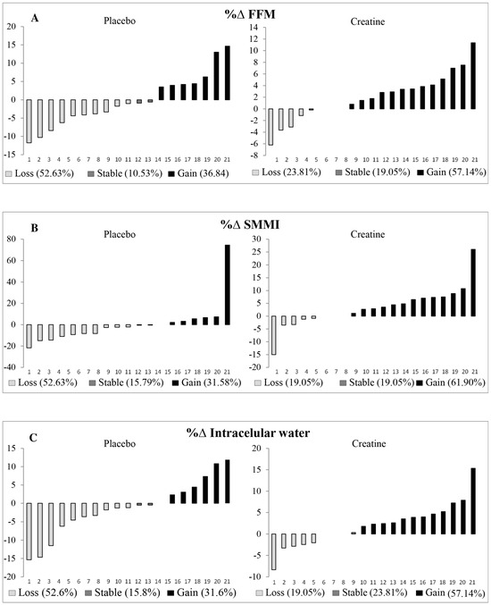 In a previous study by our group, it was found that creatine supplementation can attenuate the loss of LBM compared to placebo. After one month of supplementation, 28.6% and 71.4% of the PG patients had LBM loss and remained stable, respectively. On the other hand, in the CG, 14.4% of the patients showed loss of LBM, 42.8% remained stable and 42.8% gained [15]. Likewise, in the present study, we confirmed that long-term supplementation with creatine may be beneficial. In other words, 60% of patients from the CG had increased FFM and 20% had reduced FFM, whereas in the PG, only 36.8% had increased and 52.6% had reduced FFM at Time 1. Moreover, 65% of patients from the CG had an increased SMMI and 20% presented with a reduction, whereas in the PG only 15.8% had an enhancement and 52.6% had a reduction at Time 1. Although in the previous study we did not evaluate hydration status (TBW) and storage compartments of these fluids (ICW and ECW), it is probable that the gain of lean mass is related to the increase in TBW.