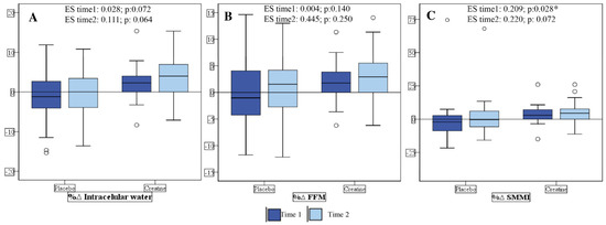Figure 4. Delta of % change in intracellular water (A), Fat-Free Mass (FFM) (B), and Skeletal Muscle Mass Index (SMMI) (C) in the creatine and placebo groups. ES: Effect size. Time 1: Difference between pre and intermediate time points; Time 2: Difference between pre and post. * p < 0.05 was considered as significant.