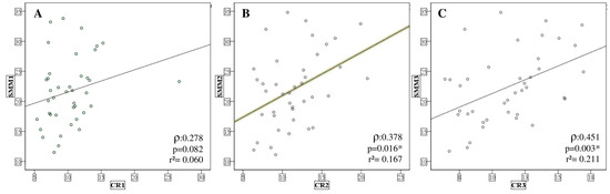 Figure 5. Spearman’s correlation test between SMMI and creatinine. CR: creatinine, SMMI: Skeletal Muscle Mass Index. (A) Pre; (B) Intermediate; and (C) Post; * p < 0.05 was considered as significant.