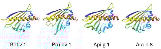 The allergens associated with the vegetable foods analyzed in this review are cataloged in the Pfam database, a comprehensive collection of protein families represented by multiple sequence alignments and hidden Markov models (HMMs) []. The current version encompasses 16,295 protein families, organized into superfamilies referred to as clans in Pfam (e.g., the prolamin superfamily). Certain families are further subdivided into subfamilies, such as the PR-10-like proteins subfamily within the Bet v 1 family [].