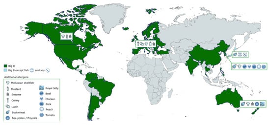 Examples of allergies subject to obligatory allergy labeling across the world. The eight main allergies, or “The Big 8,” are indicated in shades of green for the nations where they are present and need to be notified. Country-specific allergies that are also required to be labeled are displayed with specialized icons. (Adapted from Fiocchi et al., 2021) [].