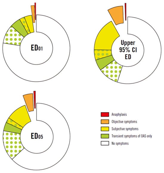 Objective symptoms after exposure to an ED01 or ED05 amount of peanuts. OAS = oral allergy symptoms. ED01, the eliciting dose predicted to provoke reactions in 1% of the allergic population; ED05, the eliciting dose predicted to provoke reactions in 5% of the allergic population. (Adapted from Turner et al., 2022) [,].