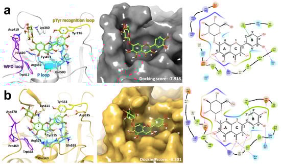 Docking model of quercetagitrin (QG). Ligands are depicted using ball−and−stick models, while critical motifs and residues of PTPN6 are emphasized with color. Hydrogen bonds are illustrated with yellow dashed lines. π–π stacking and π–cation interactions are represented as blue and green dashed lines, respectively (left). (a) Model of QG (pale green) on PTPN6 (white, PDB ID: 3PS5). The PTPN6 surface is shown in gray (center). 2D diagram of docking model (right). (b) Model of QG on PTPN9 (gold, PDB ID: 4GE6, left). The PTPN9 surface is shown in gold (center) and 2D diagram of docking model (right).