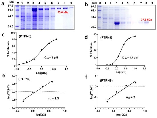 Quercetagitrin (QG) effectively hinders the catalytic action of both PTPN6 and PTPN9. (a,b) SDS−PAGE analysis of PTPN6 (a) and PTPN9 (b) with molecular weights of 73.0 kDa and 37.6 kDa respectively. M, protein molecular weight marker; 1: total cell lysate before induction; 2: supernatant before induction, 3: total cell lysate after induction, 4: supernatant after induction; 5: the sonicated sample flowed through the resin; 6: Sample collected post-column washing with lysis buffer; 7: Sample collected post−column washing with lysis buffer that includes 10 mM imidazole; 8 and 9: protein extracted with lysis buffer containing 100 mM imidazole. (c,d) IC50 values for QG, determined by % inhibition against log [QG] (μM) using a sigmoidal graph (e,f) nH values in Hill plots are calculated from the slopes obtained through the Hill equation.