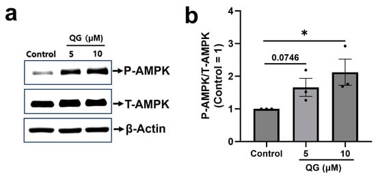 Increased AMPK phosphorylation is an important molecular signature of the anti-diabetic activity of therapeutic phytochemicals []. Therefore, the effects of QG treatment on AMPK phosphorylation were analyzed. In this study, differentiated C2C12 myoblasts were evaluated. Our investigation revealed that treatment with 5 and 10 μM QG notably enhanced AMPK phosphorylation (p = 0.076 and p < 0.05 respectively; Figure 4a,b). These findings suggest that QG successfully increased AMPK phosphorylation.