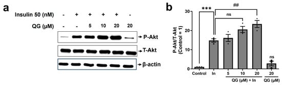 Quercetagitrin (QG) demonstrates an insulin-sensitizing effect by stimulating the phosphorylation of Akt. (a) Differentiated C2C12 myoblasts were treated with the control (0.1% DMSO, 50 nM insulin (as a positive control, represented as In), co-treatment with 5, 10, or 20 μM QG (6 h) and 50 nM insulin (30 min), or 20 μM QG alone (6 h), followed by Western blotting using antibodies targeting phosphorylated Akt (P−Akt), total Akt (T−Akt), and β−actin. (b) Quantitative analysis of P−Akt/T−Akt levels was performed using the image analysis software (ATTO Corporation, Tokyo, Japan). Results are represented as the mean ± standard deviation. *** p < 0.001 were considered significantly different compared to the control group, ## p < 0.01 were considered significantly different compared to the positive control group, and ns is considered as non-significant compared to the positive control group.