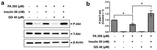 The intake of free fatty acids, notably palmitic acid, has been closely linked to the development of insulin resistance and a reduction in glucose uptake in muscle cells [,]. Whether QG confers a preventive response against palmitic acid-induced insulin resistance in differentiated C2C12 myoblasts was investigated. First, the differentiated C2C12 myoblasts were pretreated with 200 μM palmitic acid to induce insulin resistance. We found a 40% reduction in Akt phosphorylation compared to that in the insulin only group. Notably, co-treatment with insulin and QG led to an approximately 3-fold (p = 0.0172) increase in Akt phosphorylation in C2C12 myoblasts compared to that in the insulin-resistant group (insulin + palmitic acid group); Figure 6a,b). In summary, QG alleviated insulin resistance induced by palmitic acid in C2C12 myoblasts by enhancing the phosphorylation of Akt.