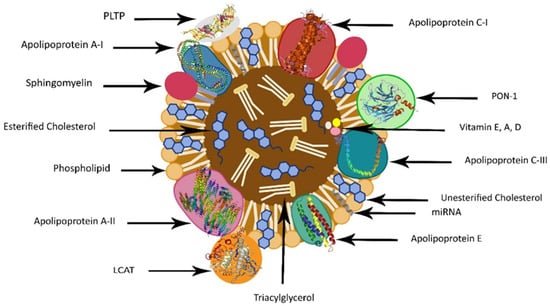 Over the past few decades, there has been increased interest in the structure of HDL. Furthermore, an HDL particle comprises a central core of esterified cholesterol, surrounded by a surface monolayer of phospholipids, free cholesterol, and apolipoproteins []. The predominant lipid composition of HDL comprises 35–50% phospholipids, 30–40% cholesterol esters, 5–12% triglycerides, 5–10% sphingolipids, and 5–10% free cholesterol []. Comprising more than 200 lipid species, HDL can be categorized into neutral hydrophobic lipids and amphipathic lipids []. The former includes esterified cholesterol and triglycerides within the core, while the latter consists of free cholesterol and phospholipids, primarily on the HDL surface. Recent studies revealed that some of the lipids that are carried by HDL can be changed into potent bioactive molecules. For instance, phosphatidylcholine (PC), the most prevalent phospholipid in HDL, is extremely susceptible to oxidation, which after hydrolysis generates the highly reactive and damaging Lysophosphatidylcholine (LPC) [].