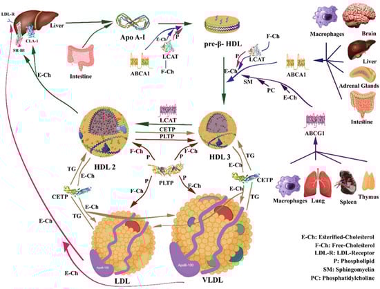 The reverse cholesterol transport (RCT) mechanism involves several steps mediated by HDL, whereby cholesterol is removed from peripheral tissues and transported to the liver for eventual excretion. In response to the macrophage’s inability to remove excess cholesterol acquired through the enterohepatic pathway or produced endogenously, a return mechanism known as reverse cholesterol transport (RCT) is implemented. This mechanism is initiated with nascent HDL particle formation, which then receives free cholesterol from peripheral tissues, through ATP-binding cassette—A1 (ABCA1) proteins. At this stage, additional receptors, including scavenger receptor class B type I (SR–BI), intervene to facilitate the anchoring of HDL to the plasma membrane as well as membrane cholesterol desorption. Upon maturation, HDL interacts with ATP-binding cassette-G1 proteins (ABCG1) within the intravascular compartment. LCAT, in the presence of its cofactor apo A-I, esterifies free cholesterol. Subsequently, the cholesterol ester transfer protein (CETP) enriches HDL with triglycerides (TG), leading to HDL maturation. The transformation from HDL3 to HDL2 is further facilitated by enzymes like cholesteryl ester transfer protein (CETP) and phospholipid transfer protein (PLTP). Consequently, cholesterol clearance is the main function of HDL. Throughout this process, HDL delivers cholesterol to peripheral tissues and organs, especially the liver via direct and indirect pathways (Figure 2). The direct pathway involves selective cholesterol uptake by hepatocytes through SRB1, while the indirect pathway relies on the effects of CETP to facilitate the exchange of cholesterol esters for TG, between mature HDL and particles containing ApoB, especially VLDL and LDL []. The LDL receptor will capture these cholesterol esters in the liver as part of the LDL, eliminating them as cholesterol or bile acids.