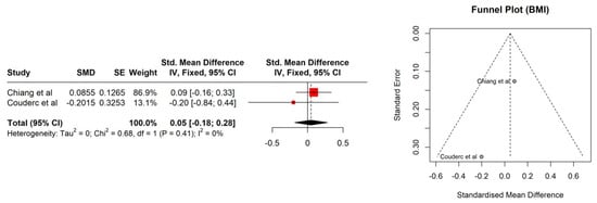 Forest plot (left) and funnel plot (right) meta-analyses of BMI.