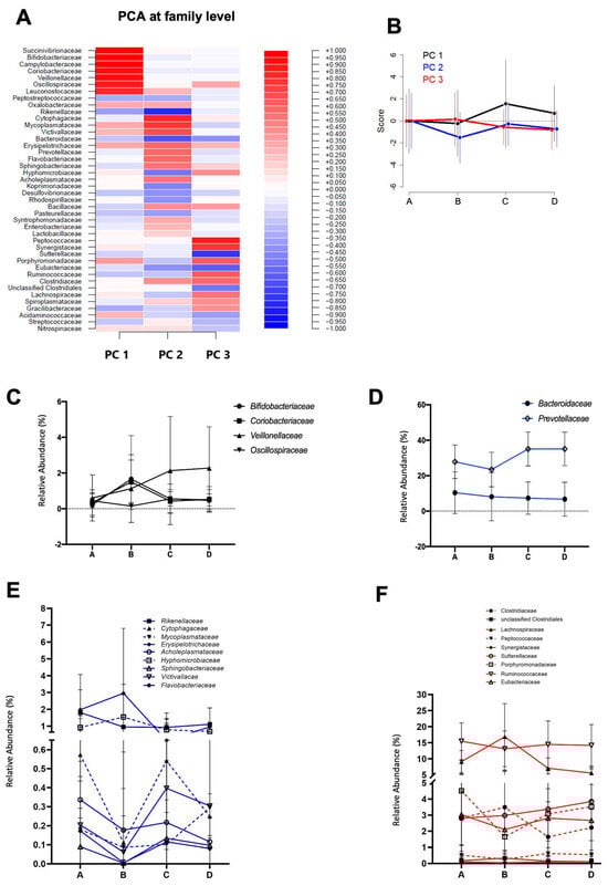 Microbiota dynamics during La Vuelta. (A). Heatmap of the principal component analysis (PCA) at the family level, including the coefficients for each family in the different PCs identified: Principal Component 1, PC1; Principal Component 2; PC2; Principal Component 3, PC3). (B). Dynamics of the PCs at the different sampling points, A–D. It shows the mean and standard deviation of the score obtained by applying the model at each sampling point. (C). Relative abundance of the families with coefficients < −0.5 or >0.5 in the PC1 at the different sampling points, A–D. (D). Relative abundance at the different sampling points, A–D, of the families with coefficients < −0.5 or >0.5 in the PC2 and relative abundances > 5%. (E). Relative abundance at the different sampling points, A–D, of the families with coefficients < −0.5 or >0.5 in the PC2 and relative abundances < 5%. (F). Relative abundance of the families with coefficients < −0.5 or >0.5 in the PC3 at the different sampling points, A–D. A: sampling point immediately before the first stage; B: sampling point after 9 stages; C: sampling point after 16 stages; D: sampling point after 20 stages.