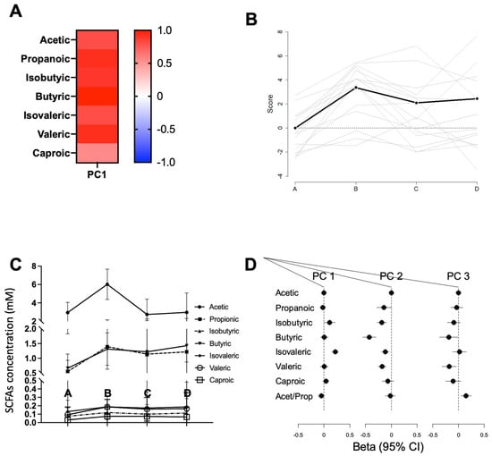 Short-chain fatty acid (SCFA) dynamics during La Vuelta. (A): Heatmap of the principal component analysis (PCA), including the coefficients for each SCFA in the PC identified. (B). Dynamics of the PC at the different sampling points, A–D. It shows the mean and standard deviation of the score obtained by applying the model at each sampling point. (C). Relative abundance of the SCFAs at the different sampling points, A–D. (D). Forest plot showing the global relationship between the principal components identified for microbiota (Principal Component 1, PC1; Principal Component 2, PC2; Principal Component 3, PC3) and SCFAs. The dots represent the estimated effect (beta), and the lines represent the 95% confidence interval. A: sampling point immediately before the first stage; B: sampling point after 9 stages; C: sampling point after 16 stages; D: sampling point after 20 stages.