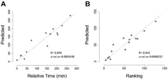 Performance prediction based on microbiota components. (A): Correlation analysis between predicted final accumulated time based on GEE models analysis and relative time, measured as the difference in the final accumulated time of each cyclist with respect to that of the best classified of those included in the study. (B): Correlation analysis between predicted final ranking based on GEE model analysis and final ranking.