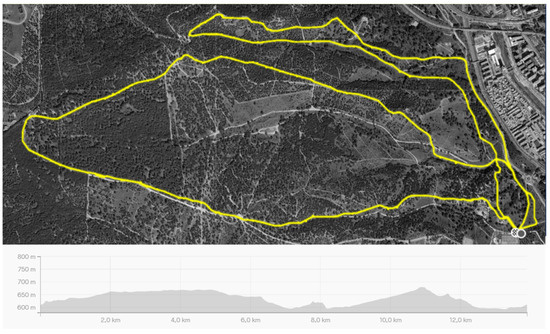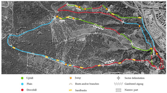 The cross-country cycling course was designed at Casa de Campo Park in Madrid, an area where races belonging to the professional mountain bike racing circuit had previously been held. The circuit in this experiment had a total distance of 13.90 km and 208 m of cumulative positive ascent. The circuit was designed to include both technically and physically demanding sections to make it as similar as possible to a real cross-country cycling race (Figure 1).