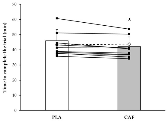 Time to complete a cross-country cycling time trial after consuming 3 mg/kg body mass of caffeine in the form of coffee or a placebo in the form of decaffeinated coffee. (*) Significant differences between caffeine and placebo conditions (p < 0.050). CAF = caffeinated coffee; PLA = placebo/decaffeinated coffee. The columns represent the group’s average with each treatment and the whiskers represent a standard deviation of 1. The solid lines represent individual responses for participants with lower time trials with CAF than with PLA. The dashed lines represent individual responses for participants with higher time trials with CAF than with PLA.