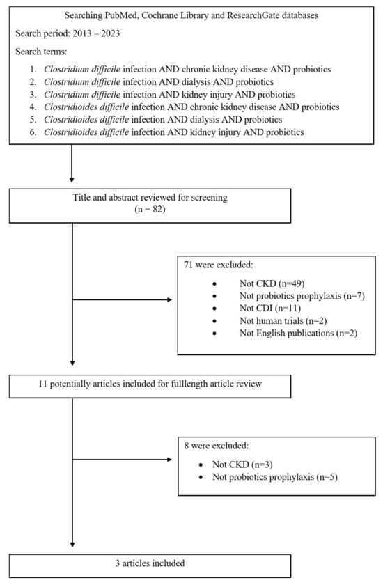 This literature review was based on the PubMed, Cochrane Library and ResearchGate databases using the keywords Clostridium difficile infection, Clostridioides difficile infection, chronic kidney disease, dialysis, kidney injury, probiotics. Original articles, review articles, and case reports from January 2013 to August 2023 were included in this analysis. Details are presented in the flow chart (Figure 1).