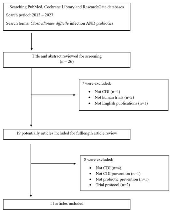 Due to the limited amount of data on the use of probiotics in the prevention of CDI in the population of patients with chronic kidney disease, it was decided to analyse the available data on the general population. The review was based on the PubMed, Cochrane Library, and ResearchGate databases using the keywords Clostridioides difficile infection and probiotics. Only original articles on clinical and randomized controlled trials from January 2013 to August 2023 were included in this analysis. The details are presented in the flow chart (Figure 2).