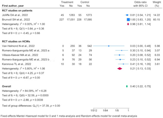 Forest plot of randomized controlled trials (RCTs) conducted separately on healthcare workers (HCWs) and patients, as well as collectively [23,25,28,29,35,36].