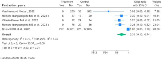 Four out of the five RCTs performed on HCWs compared vitamin D supplementation with no treatment or dietary measures (treatment vs. no treatment). One evaluated the effect of a higher dosage versus a low vitamin D dosage. The treatment vs. no treatment analysis confirmed low heterogeneity among the studies and a higher protective effect of vitamin D supplementation (OR 0.177, 95% IC 0.104–0.301).