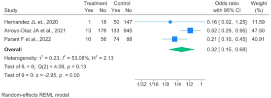 Three analytical studies evaluated the effect of previous vitamin D supplementation and ICU admission due to complications of COVID-19 infection. The meta-analysis performed with the random-effects model revealed that prior vitamin D supplementation may have a protective role against ICU admission (OR 0.317, 95% IC 0.147–0.680) (Figure 4).